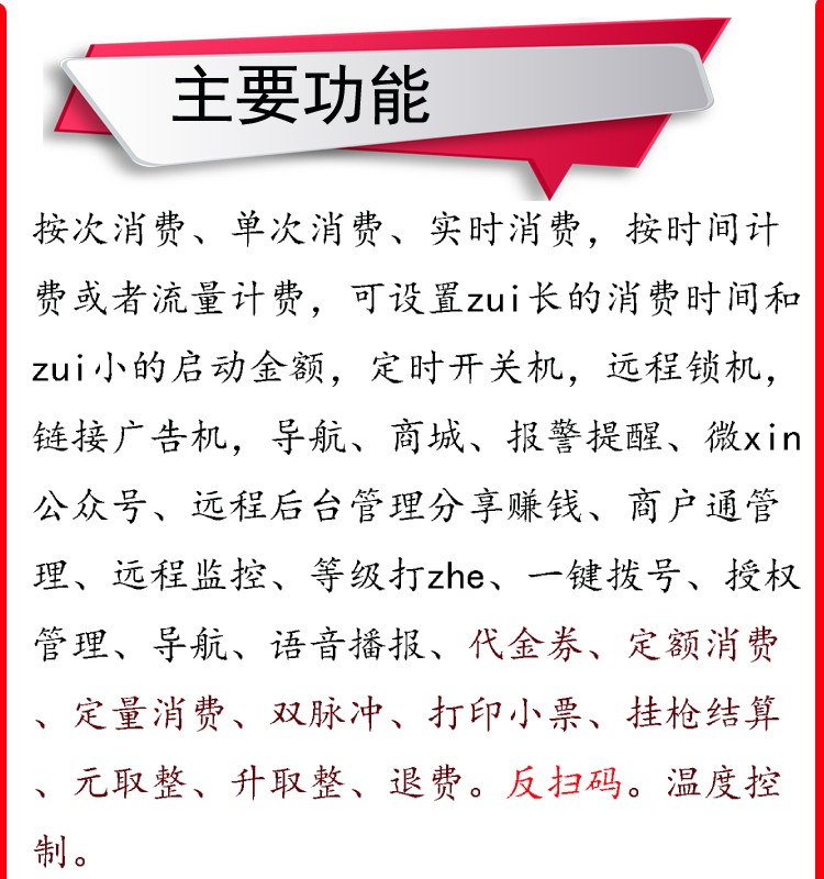 产品功能 :按次消费、单次消费、实时消费,按时间计费或者流量计费,可设置最长的消费时间和最小的启动金额,定时开关机,远程锁机,链接广告机,导航、商城、报警提醒、微信公众号、远程后台管理分享赚钱、商户通管理、远程监控、等级打折、一键拨号、授权管理、GPSD 定位、语音播报、代金券、定额消费、定量消费、双脉冲、打印小票,挂枪结算,元取整,升取整,退费。反扫码。温度控制。